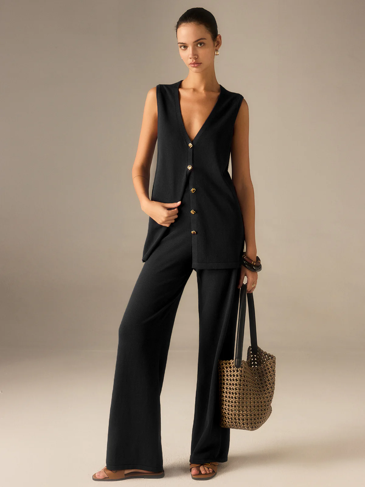 Golden Button Knit Vest Pants Set