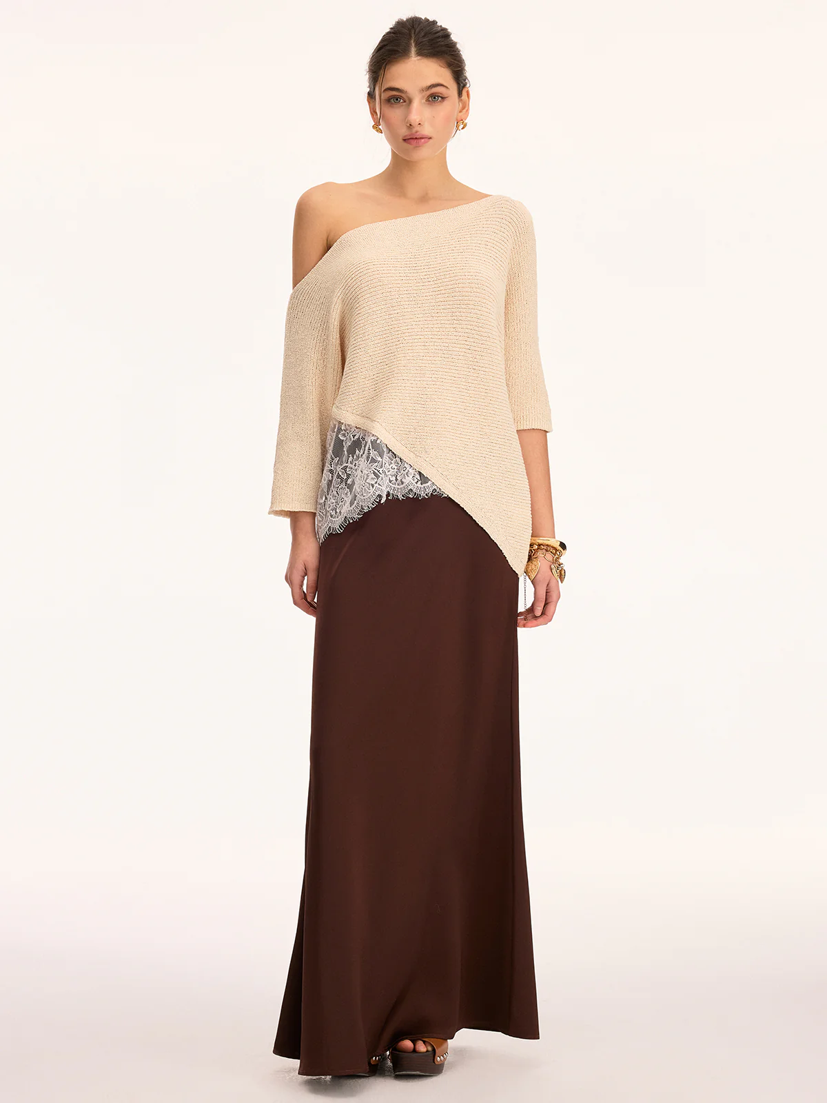 Asymmetrical Lace Trim Boat Neck Knit Top