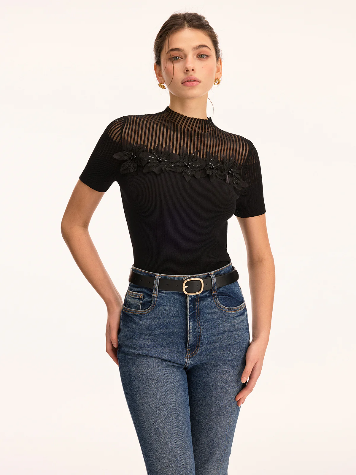 3D Floral Applique Sheer Mock Neck Knit Top