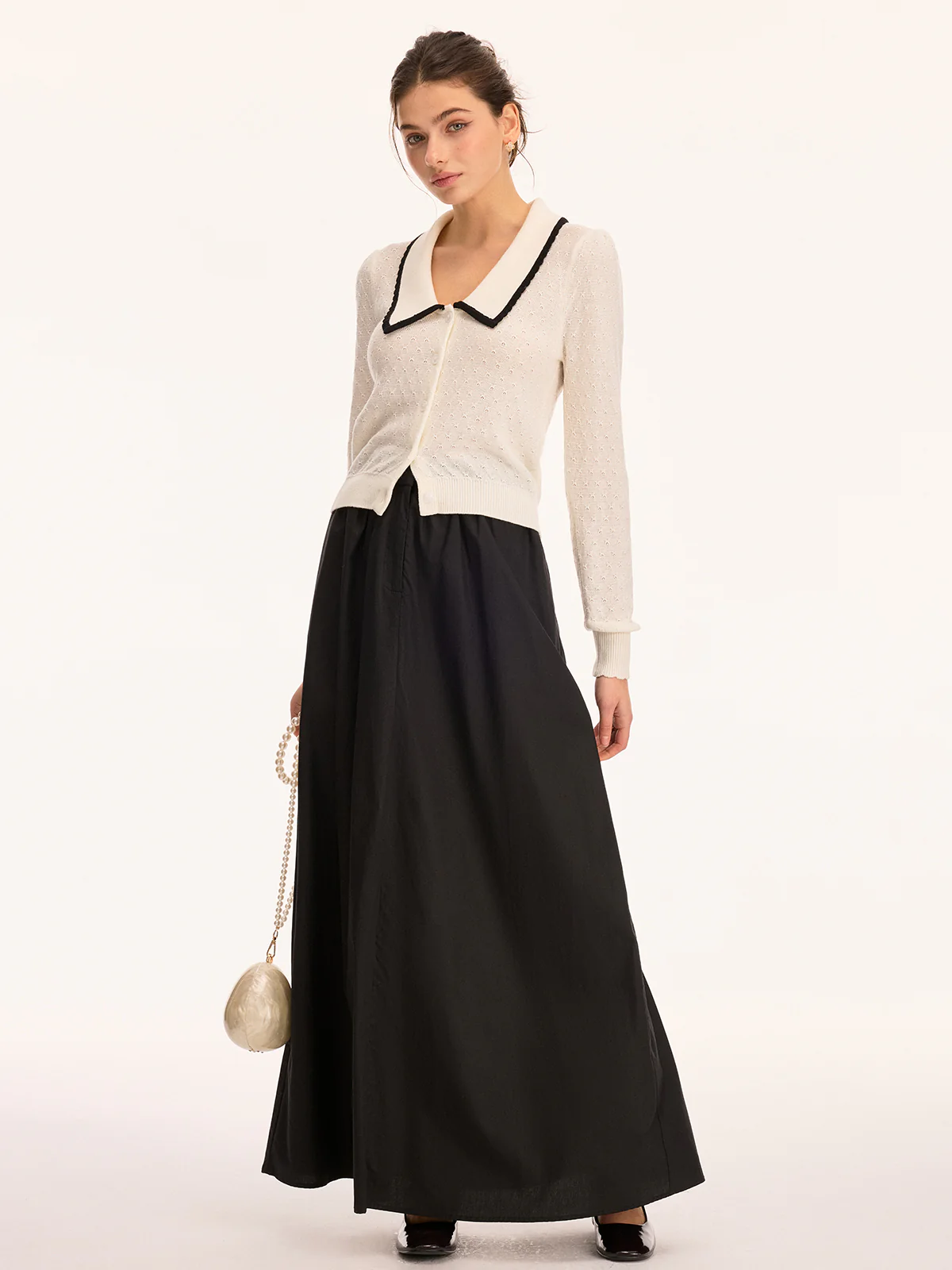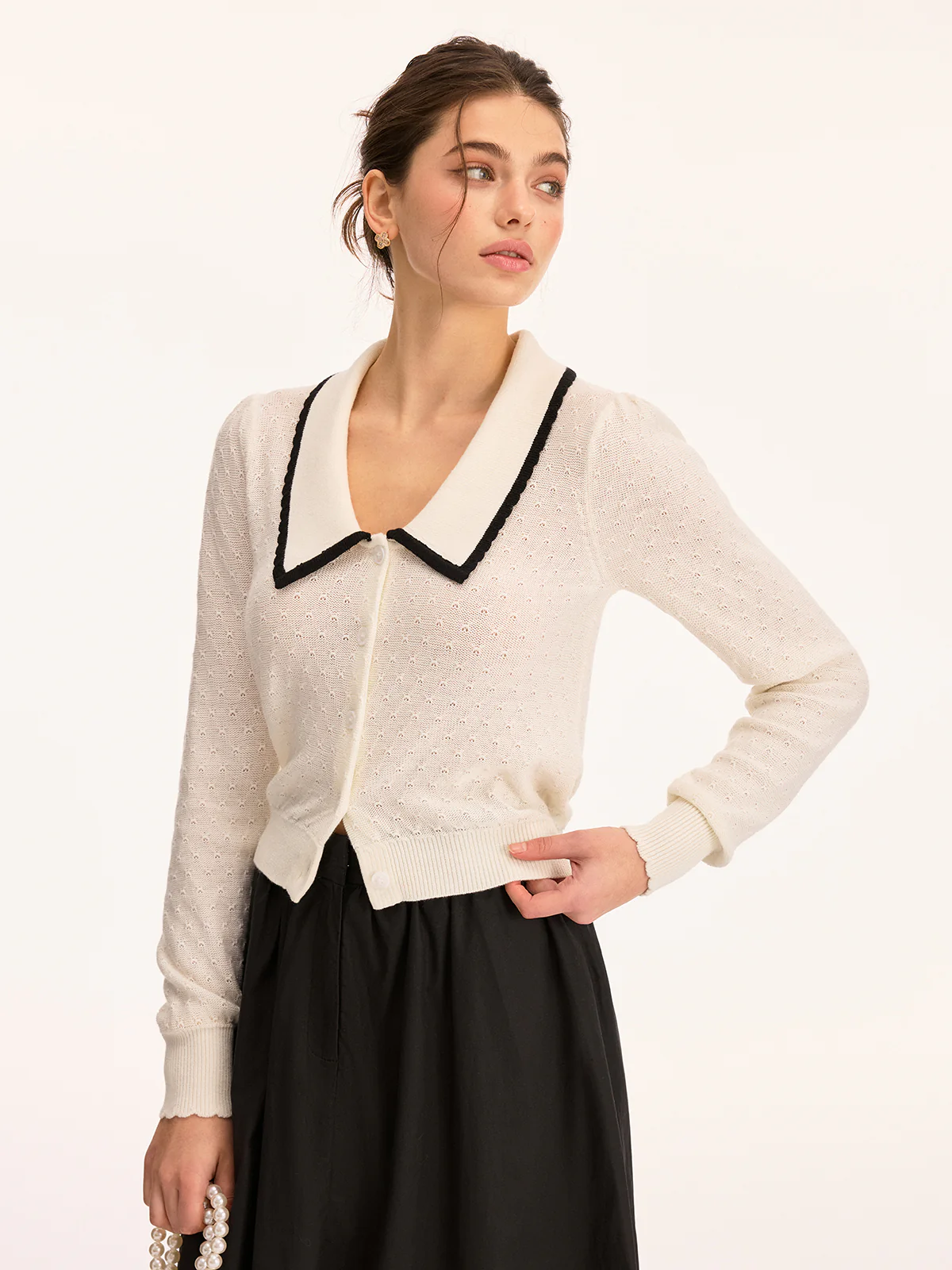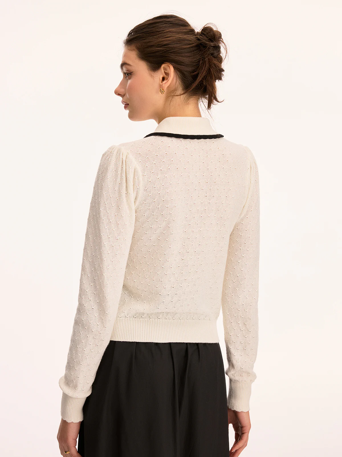 Wool Blend Collared Pointelle Knit Cardigan