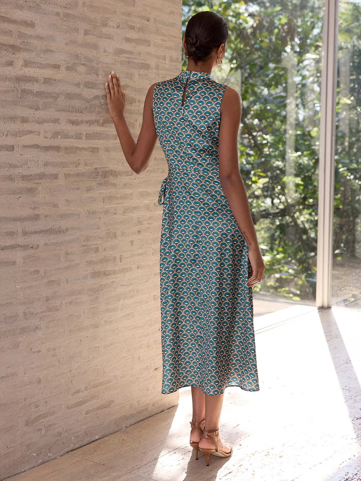 Scallop-Print Sleeveless Mock Neck Wrap Midi Dress