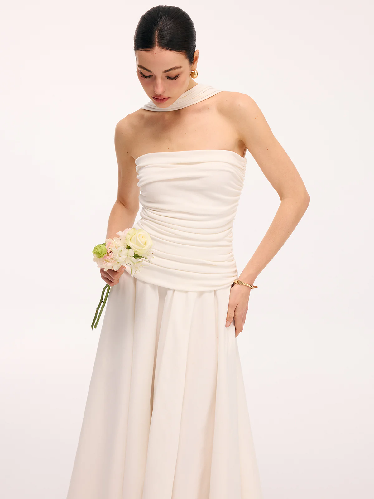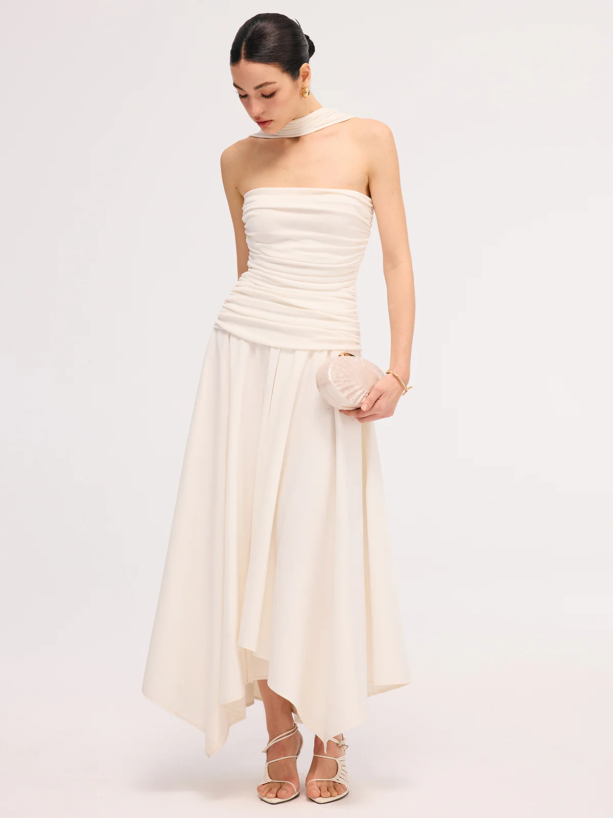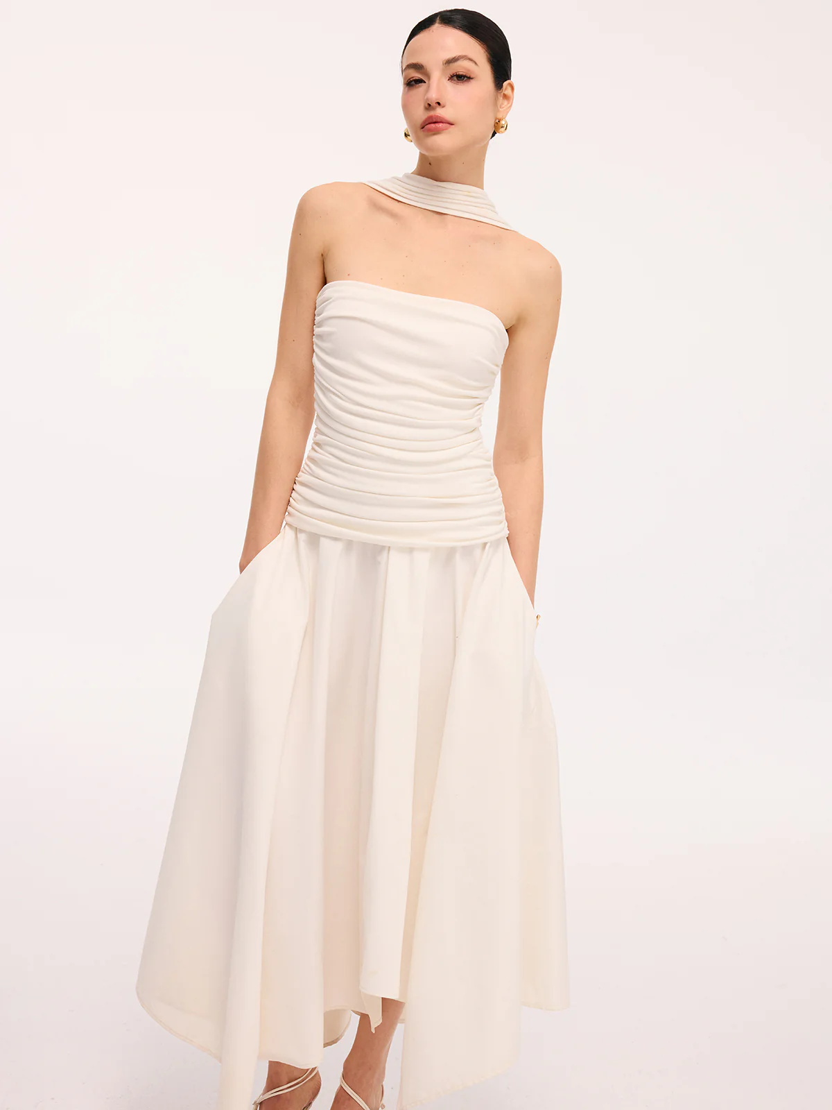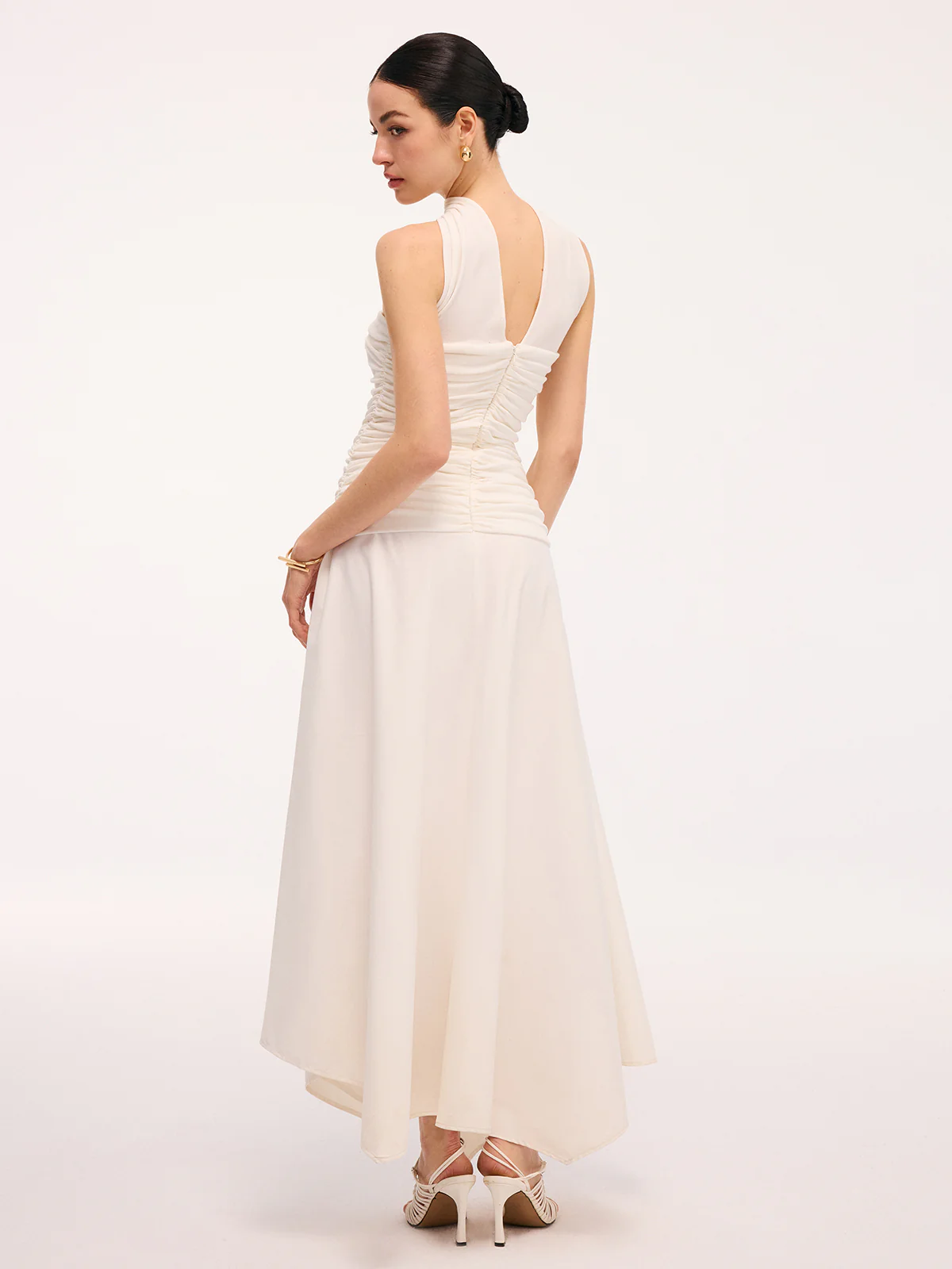 Asymmetrical Hem Ruched Halter Midi Dress