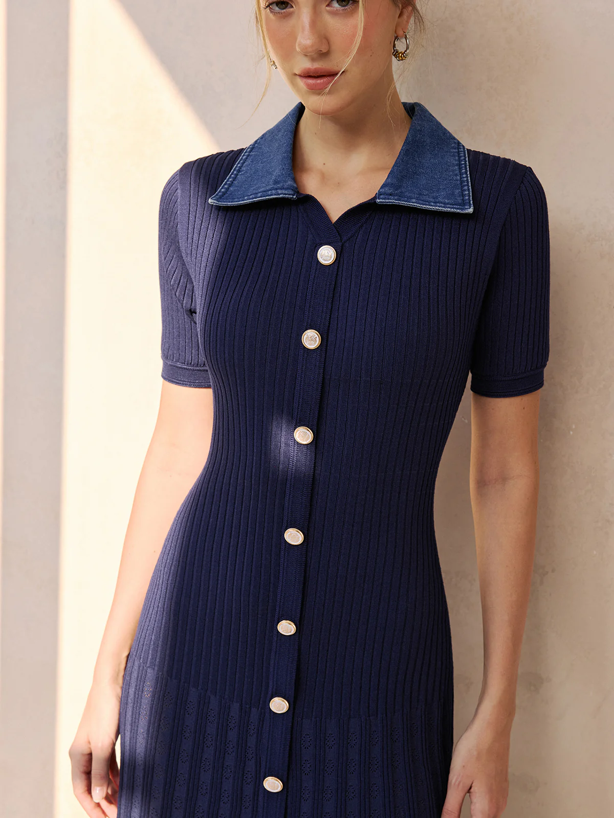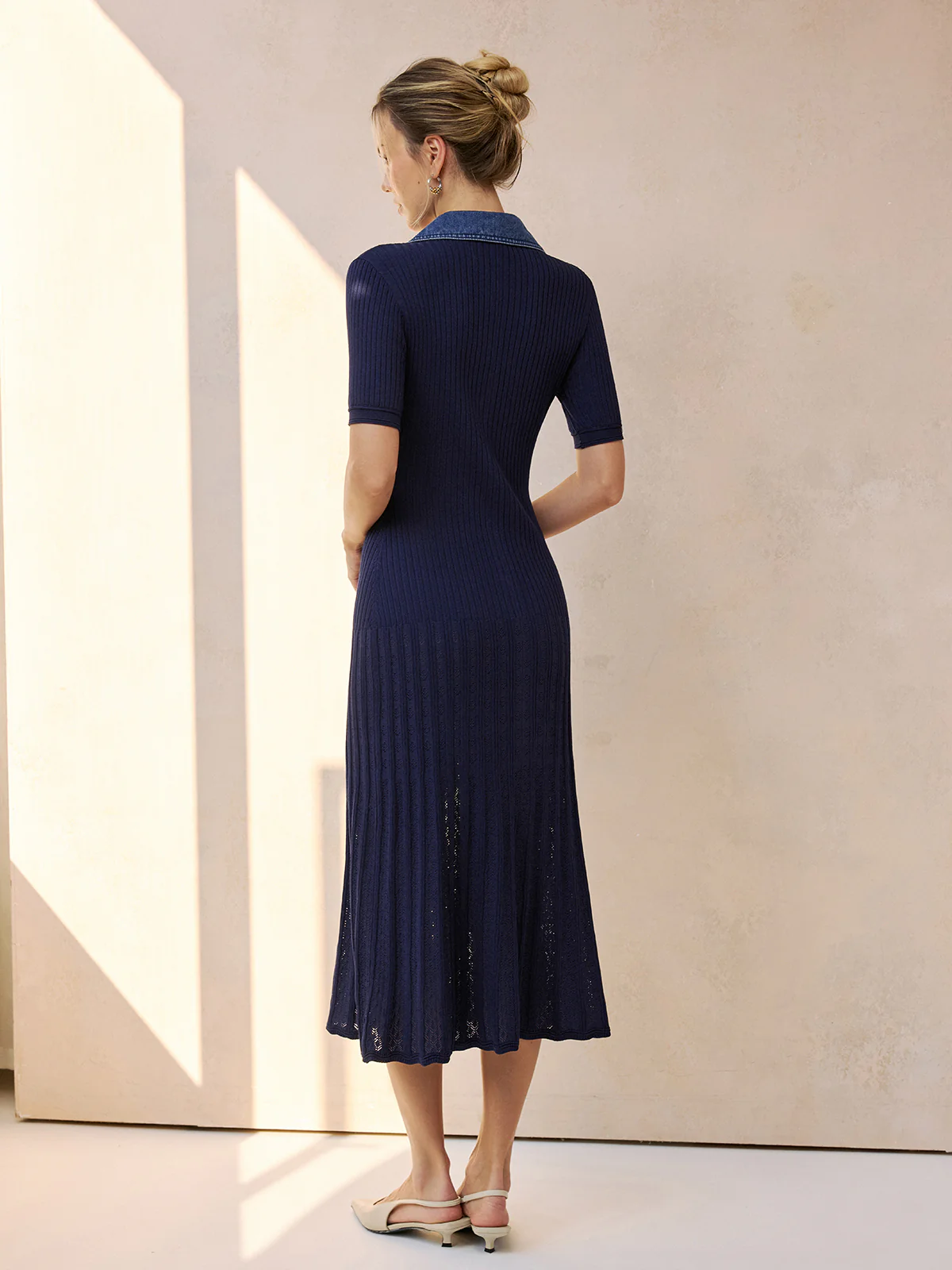 Denim Collar Ribbed Knit Midi Dress
