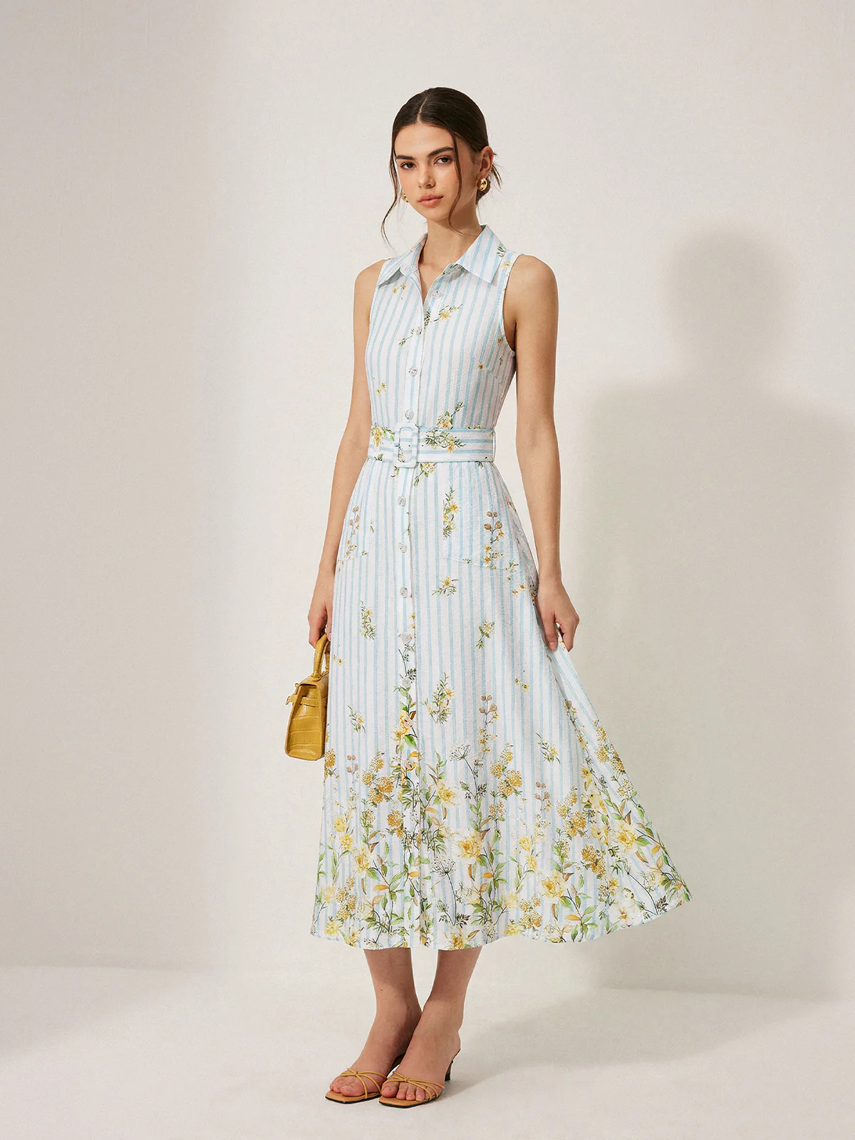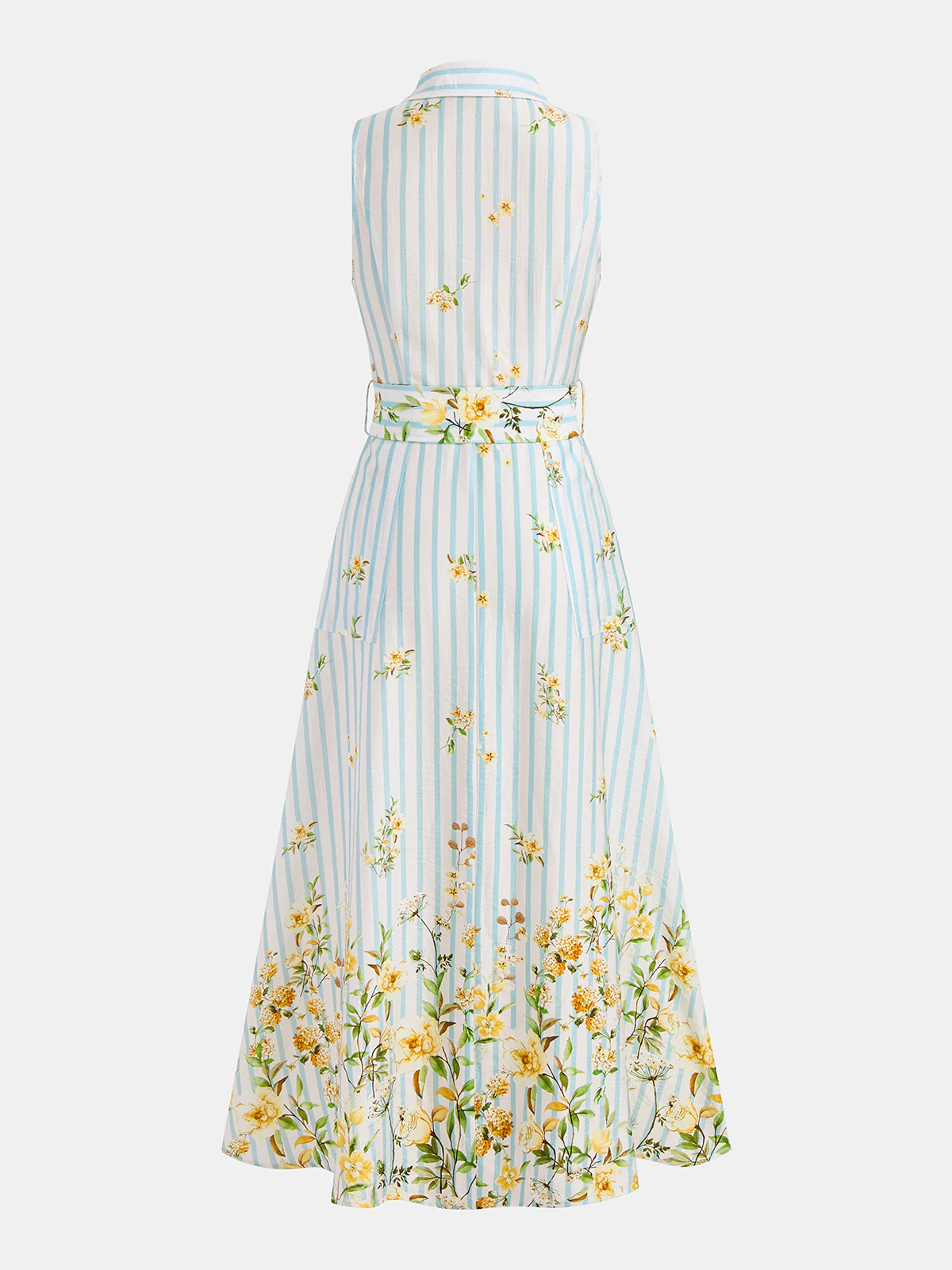 Floral Striped Sleeveless Belted Midi Dress