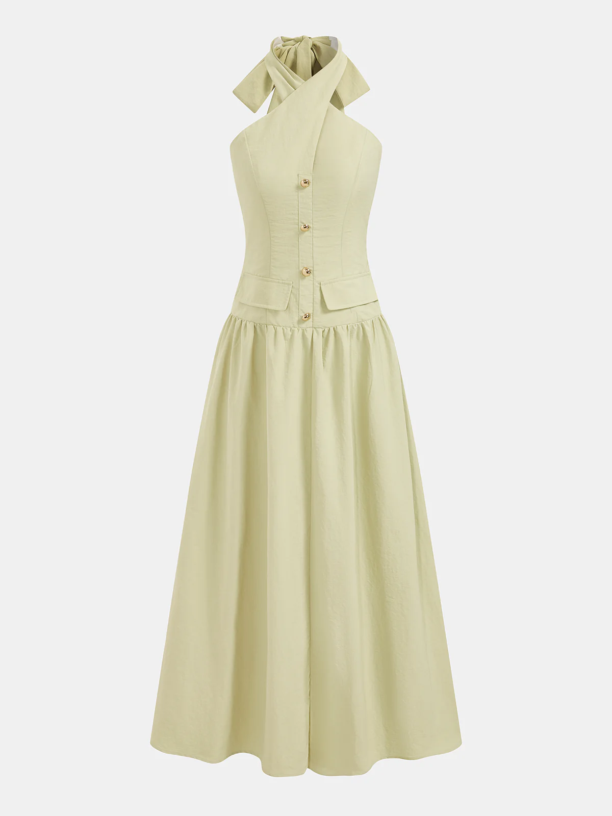Halter Neck Fitted Waist Cotton Maxi Dress