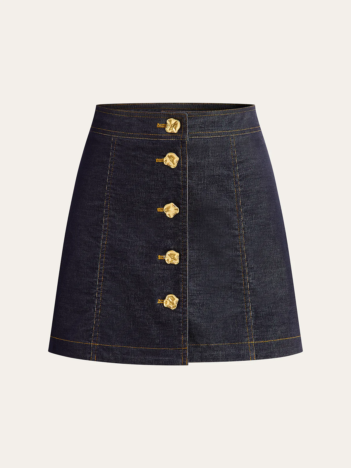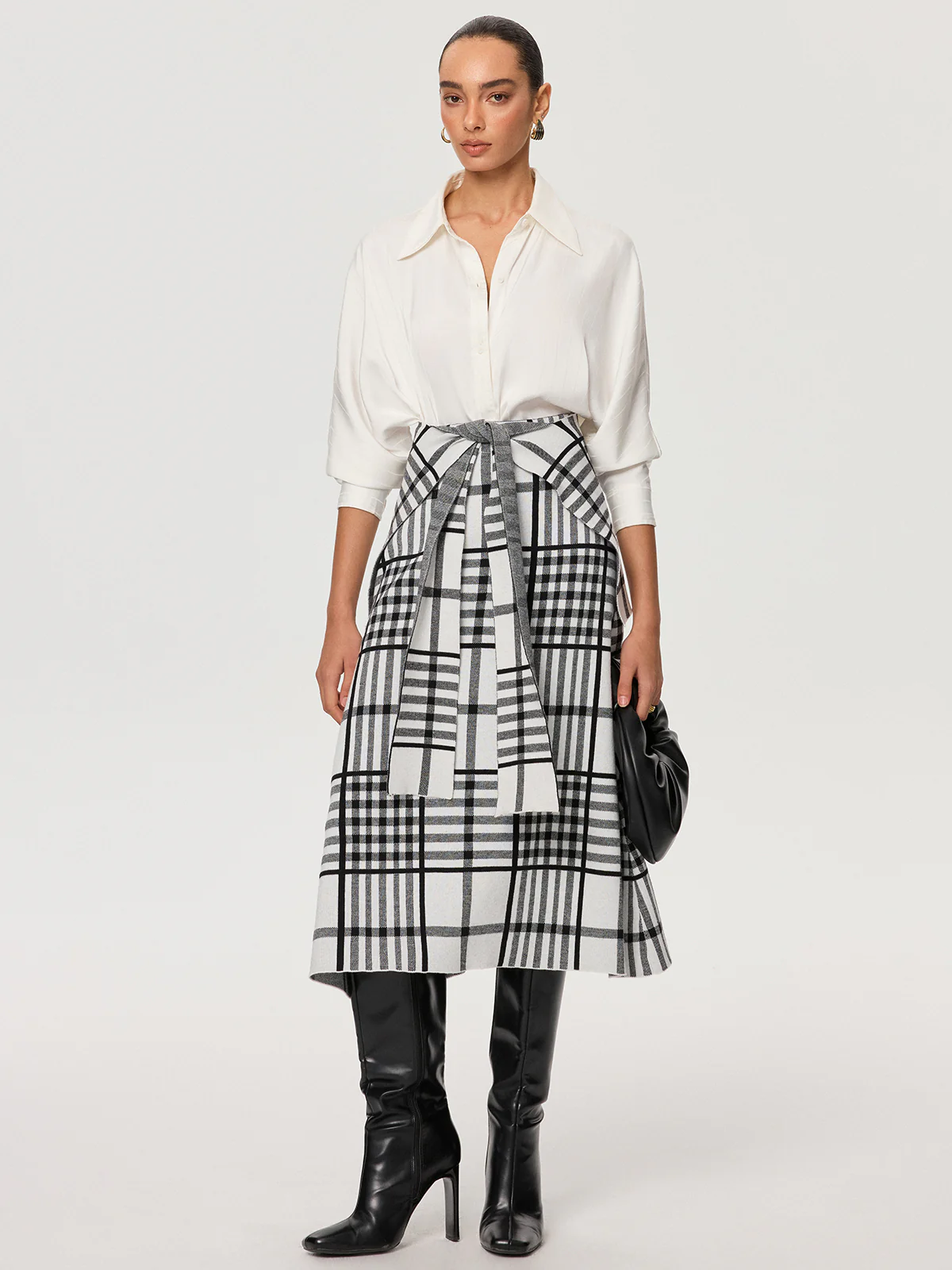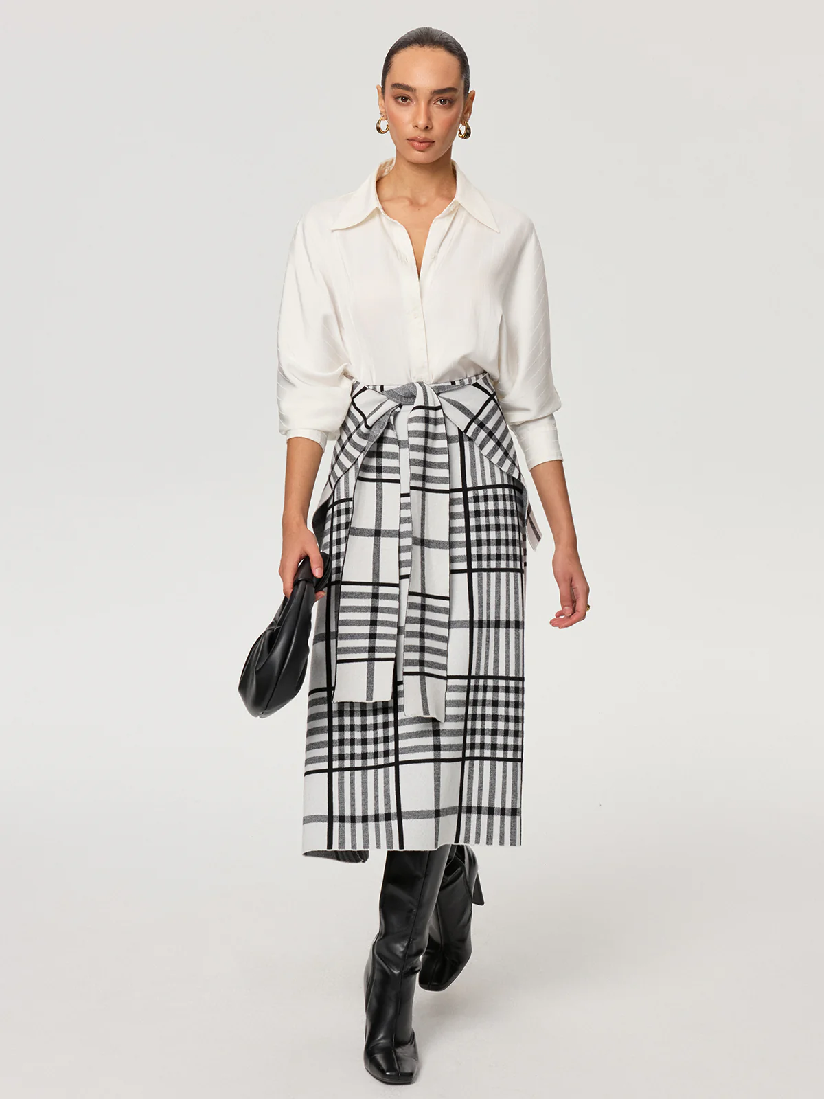 Plaid Wool Blend Midi Skirt with Apron Belt