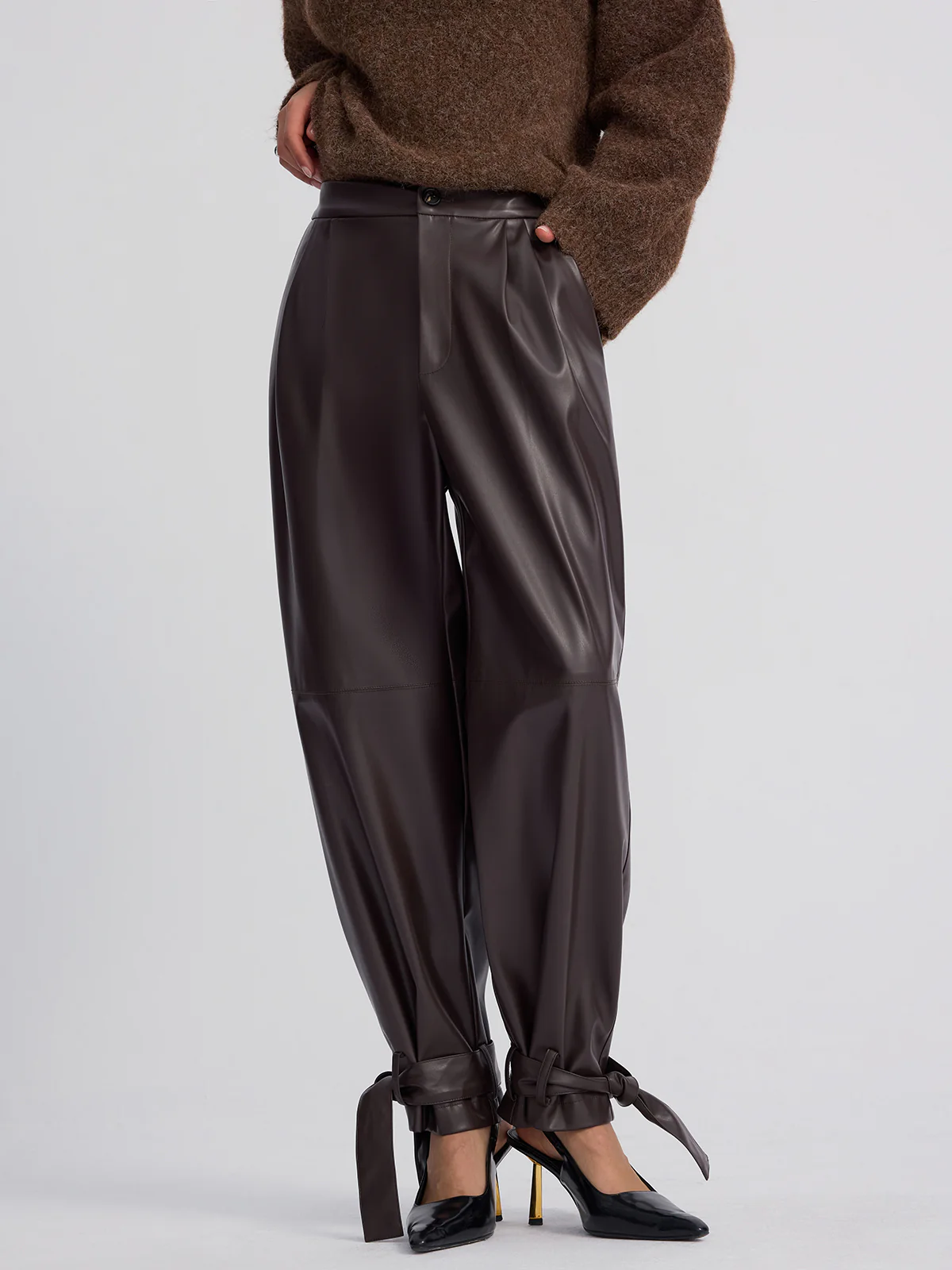 Cuff-Tie Faux Leather Tapered Pants